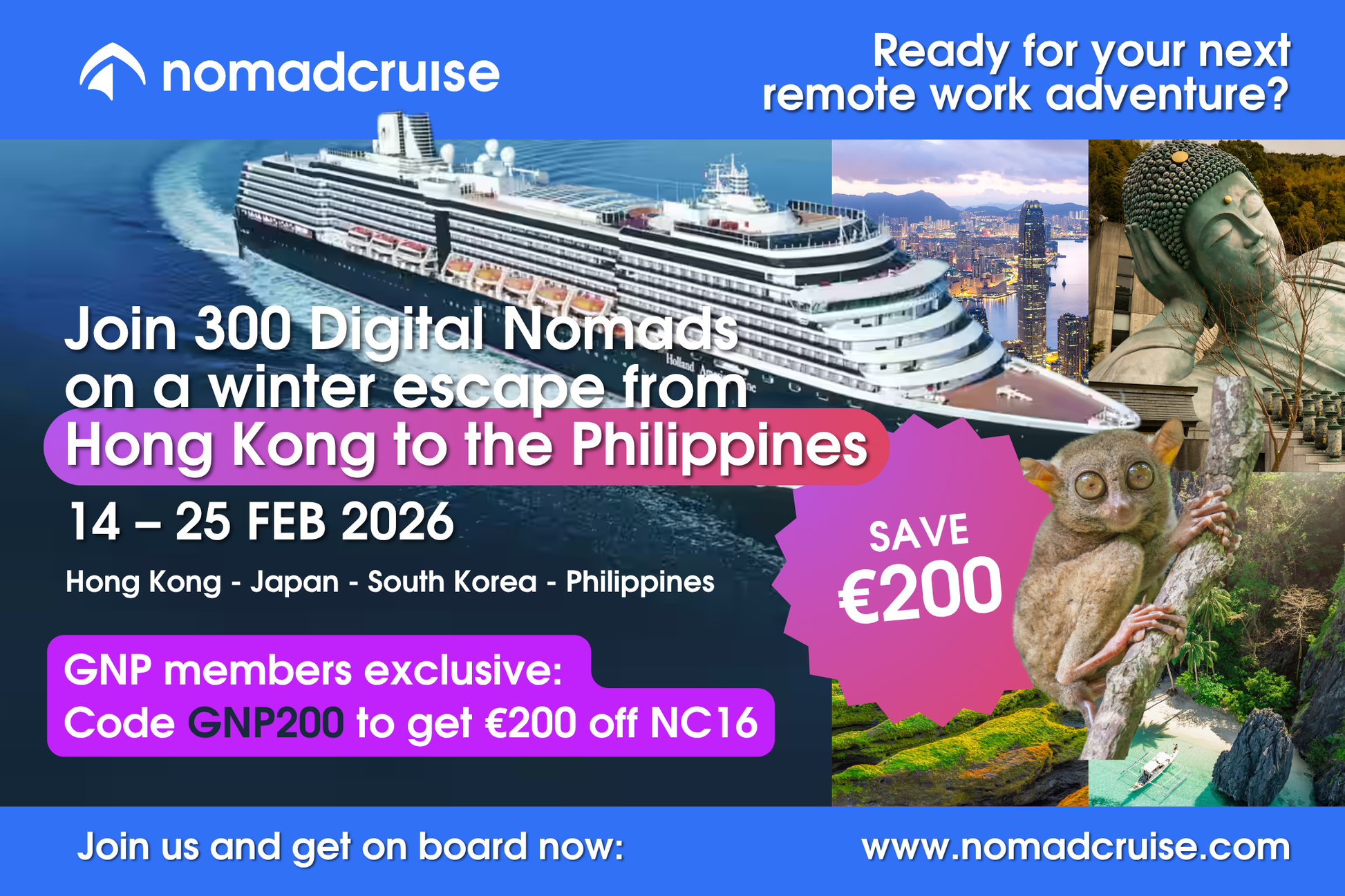 Ready for your next remote work adventure? Nomad Cruise is the ultimate experience for digital nomads and remote workers - network, collaborate, and explore amazing destinations while sailing the world. Discover new places, experience unique cultures, and make memories that last a lifetime.